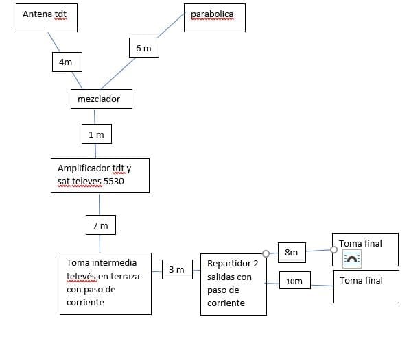 Tengo un problema en mi instalación de antena que no sé como solucionar y estoy hecho un lío y haciendo pruebas y pruebas sin resultado. Adjunto una imagen y si me podéis decir si veis algo raro en la instalación y donde puede estar el problema. La señal de tdt llega sin problema a todas las tomas, el problema es con la señal satélite de la parabólica. Muchas gracias de antemano.