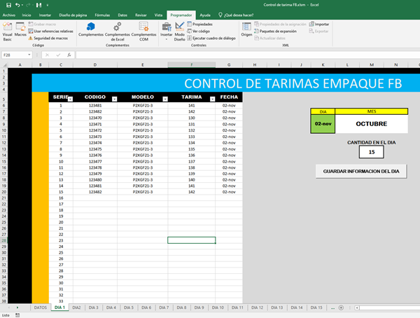 Tengo que capturar cada día en una hoja de excel (día 1 al día 31) datos (código, modelo, tarima fecha) y al final de cada día quiero mover la información a una sola hoja (datos) donde toda la información este acomodada por fecha pero no encuentro como hacerle, lo que quiero hacer es como una base de datos para poder acomodarla o usarla según se requiera, agradecería que me apoyen, adjunto mi programa
