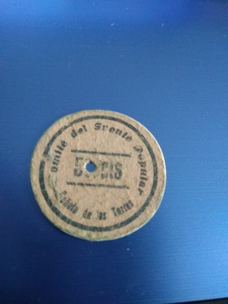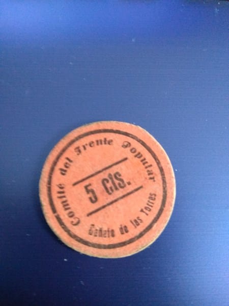 Un billete del frente popular del pueblo Cañete de las Torres de 25 pesetas rectangular tonos rojos, dos de 25 céntimos uno con agujero y otro sin, redondos de cartón color anaranjado, otro de 5 pesetas también naranja de cartón, me gustan las monedas y billetes pero de esto no sé nada.