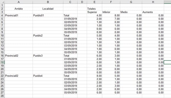 Tengo una hoja mucho mayor de lo que he puesto aquí. Necesito una fórmula que me copie todos los campos del ámbito (columna A) hasta el próximo ámbito y todas las localidades (columna B) hasta la próxima localidad. Todos los datos del cambio se producen en la fia donde pone "total" en la columna C, para todo el rango que tenga datos, que es una sucesión de filas seguidas en la columna D