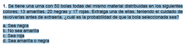 Se tiene una urna con 50 bolas todas del mismo material distribuidas en los siguientes colores; 13 amarillas, 20 negras y 17 roj