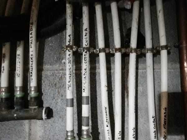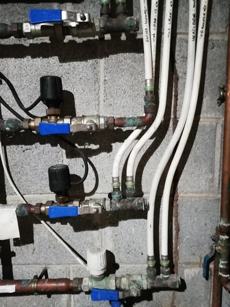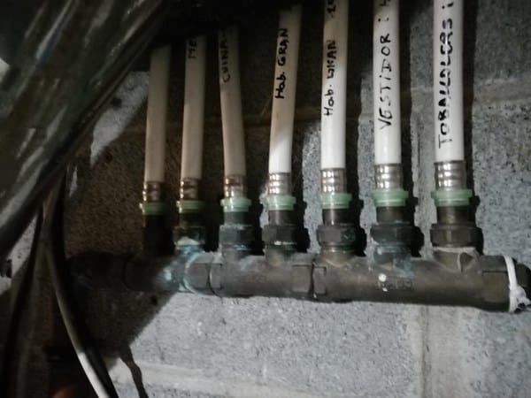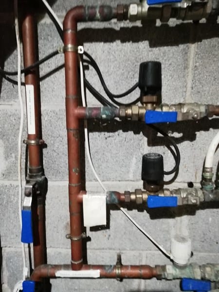 El circuito está dividido en zonas, cada cual tiene su termostato y su electroválvula para abrir la calefacción en sus radiadores.