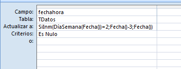Tengo una tabla que viene de un reporte que me indica los trámites que me quedaron pendientes del día anterior, y como no trae la fecha se la pego con una consulta de actualización ... Where is null ... Y en criterios date()-1... El problema me surge cuando el día que tengo el reporte es lunes y date()-1 me trae la fecha del domingo cuando en ese caso necesito la del viernes... La verdad que estuve probando varias cosas pero ya no encuentro la solución. Estaría muy agradecido si me pueden ayudar con esto.