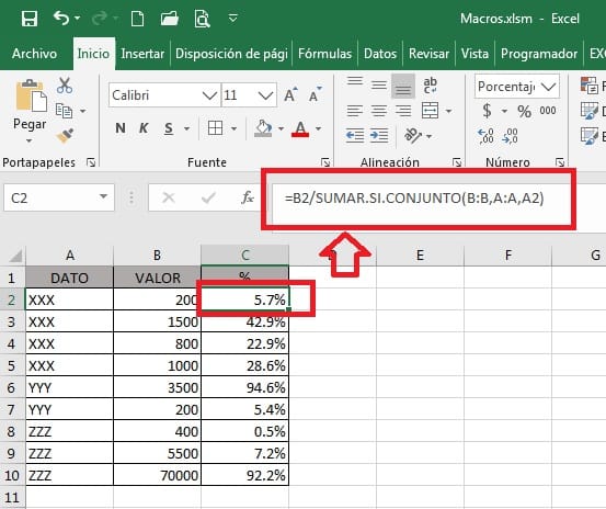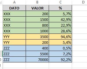 A modo de ejemplo; en la columna A tengo muchas variables y necesito calcular el porcentaje de cada una de esas variables. Desde A2:A5 tengo la variable "XXX"; A6:A7 variable "YYY", y A8:A10 variable "ZZZ" y desde B2:B10 tengo cada uno de los valores correspondientes a cada variable, necesito calcular el porcentaje en peso (%) para cada una de esas variables algo así como: B2/SUMA($B$2:$B$5) pero identificando cada variable. Dejo una foto de ejemplo.