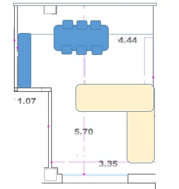 Nuestro dilema es porque el salón, en la parte de comedor es más ancho tiene 4,60 metros pero se estrecha en la parte de del sofá, que sólo tiene 3,34 m. El sofá elegido (nos encanta) tiene 2,56 x 2,56 y solo podemos ponerlo con la parte izq de la L partiendo el salón, por lo que deja una zona de paso de 70 y no sé si eso hará que se vea raro. El sofá es bajito, pero no se bien el efecto que tendrá puesto y si una vez lo compremos nos arrepentiremos. Nos gustaría tener tu opinión, si es posible. Adjuntamos un borrador, esperamos respuesta. Agradecidos.