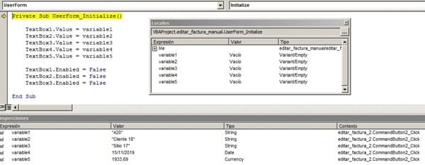 Hay poco que rascar en ese código. El caso es que las variables "factura" y "cliente" no las guarda. Cuando se está ejecutando la macro, al pasar al segundo informe, si me pongo encima de ellas con el ratón aparecen "Vacío", en lugar del valor. Las otras tres sí que las coge.