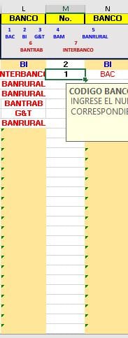 Tengo 3 columnas la columna L va a traer el banco mediante unas fórmulas, en la columna M dígito el numero del banco asignado, en la columna N mediante una fórmula me aparece el banco que asigne en la columna M por medio de un numero, me gustaría saber si se puede validar que el dato de la celda N coincida con la celda L y si no coincide que genere una alerta en la letra M. Adjunto envío un ejemplo: