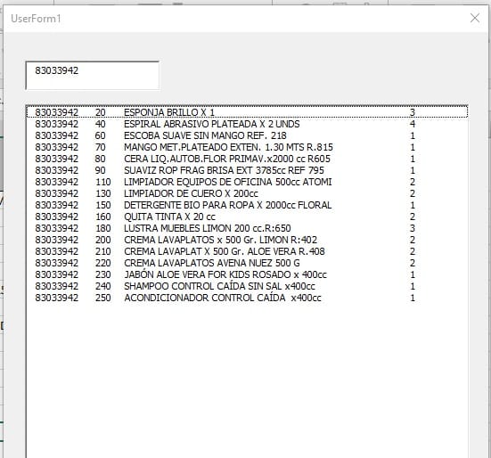 Tengo un UserForm1 y en este un ListBox1. Necesito abrir otro Userform2, que busque desde el TextBox1 del UserForm2 al ListBox1 del UserForm1. Y al hallar el dato en el ListBox1, que lo descuente y este lo agregue en la Hoja1 del Excel. Conclusión mientras yo vaya ingresando códigos que los descuente del ListBox y los agruege en la Hoja1 de Excel. Si hubiera un código que no este en el ListBox que salga un mensaje de error.