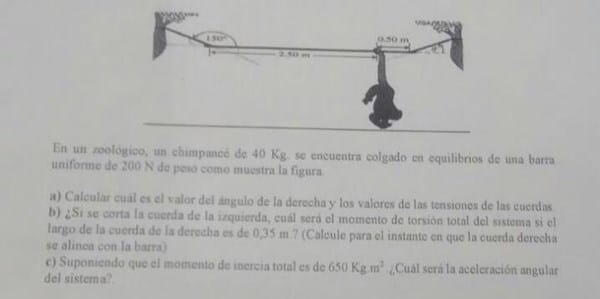 En un zoológico un chimpancé de 40 kg se encuentra colgado en equilibrio de una barra uniforme de 200 N de peso como muestra la figura