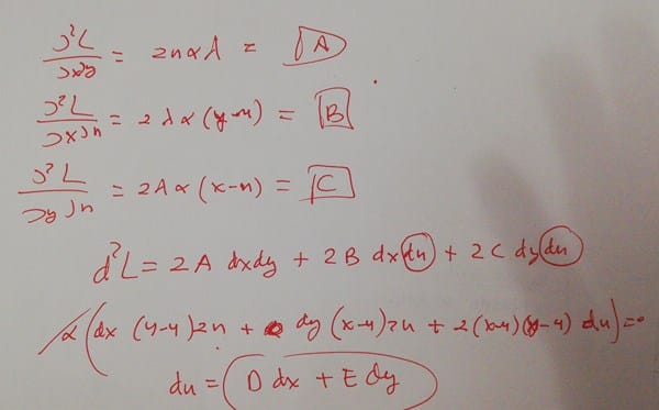 Hola, muy buenas tardes, este es un problema de optimización por multiplicadores de Lagrange, la cual no consigo sacar la segunda derivada de los diferenciales, me harían un gran favor si pudieran ayudarme a resolverlo desde el planteamiento que dale allí, el cual debe dar un mínimo.