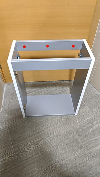 Es por ello que quería preguntaros si podría hacer 3 agujeros (puntos rojos) en la parte superior del mueble y atornillar a la pared, para ahorrarme el sistema que trae de anclaje y quitarme 5 agujeros más en baldosa porcelanica (adjunto foto).
