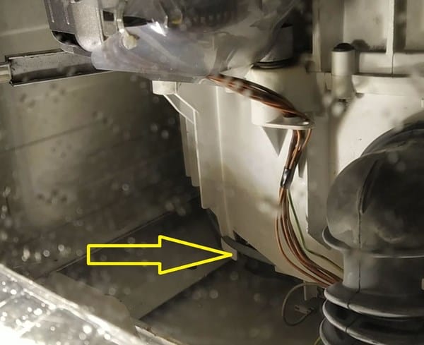No consigo identificar por de dónde sale. En una foto tomada con espejo por debajo señalo por qué empiezan a caer las gotas, parte delantera del tambor.