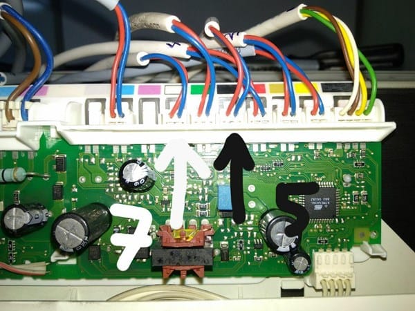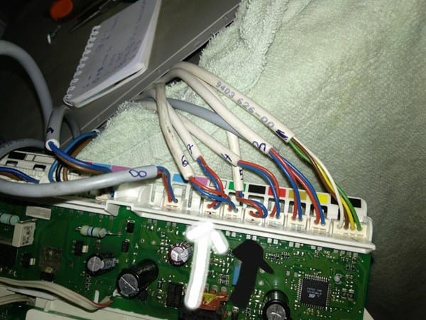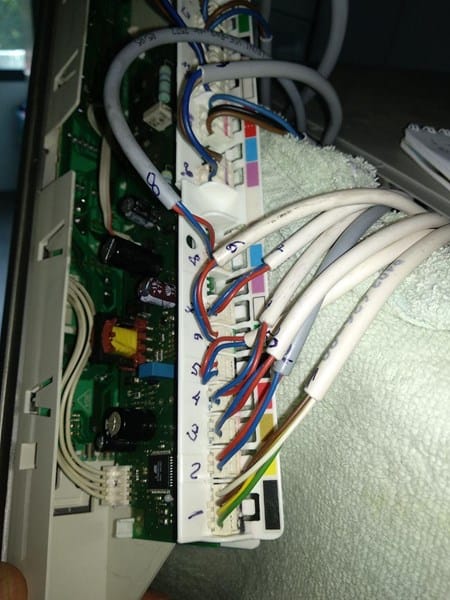 He hecho unas fotos de las sondas conectadas a la placa electrónica y las he numerado, tanto por los colores que tiene la placa en donde encajaban, como por las sondas para volver a ponerlas bien y las cifras que me han dado las sondas en posición polímetro en Ohmnios a 20k son (a unos 14ºC en nevera):