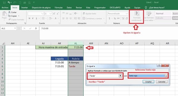 Tengo los siguientes datos, quisiera que en la columna que dice Rubrica apareciera el texto "A tiempo" o "Tarde" si en la columna de llegada sale cualquier hora después de las "07:15:00 a. M." como lo es el ejemplo del día lunes 09- dic, igual si se le puede poner ese semáforo en rojo, amarillo o verde según el rango de tiempo que de para saber si llegaron a tiempo con verde (antes de las 07:15:00 a. M.), si llegaron tarde con amarillo (pero solamente 5 minutos después de las 07:15:00 a. M.) y si llegaron después con rojo (más de 5 minutos después de las 07:15:00 a. M.)