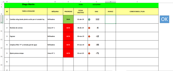 Lo que quiero hacer es que al ejecutar la macro, según la celda que tenga seleccionada, en la imagen 1, mande modifique la "Fecha estipulada", por "Proximo", y también lo ordene según sus días de atraso, osea, que primero en la lista aparezcan los que más días de atraso tienen. Y por otro lado, necesito que al ejecutar la macro, me salga un userform que me deje poner la fecha que se realizo la tarea, y la envíe a la imagen 3.