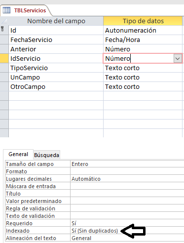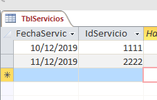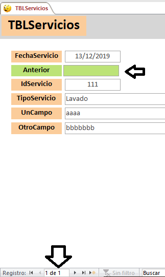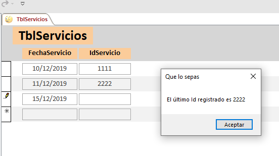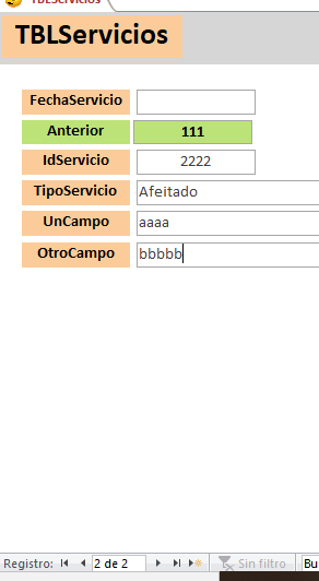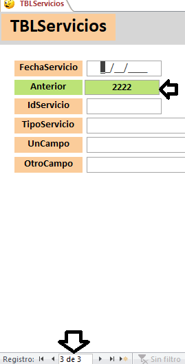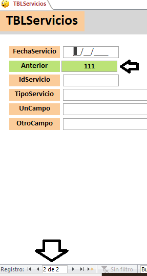 Tengo un formulario denominado formServicios donde registro los datos de los servicios que presto a una compañía y que se guardan en una tabla que se llama TblServicios en la cual hay un campo numérico denominado IdServicio en el que registro el numero de servicio contratado que me suministra la compañía a la que le presto servicios. Lo que necesito es que en cada nuevo registro pueda ver el nuevo valor que estoy agregando en el campo IdServicio así como el valor de ese mismo campo de la ultima vez que me contrataron, o sea poder ver tanto el numero de servicio actual y el penúltimo.