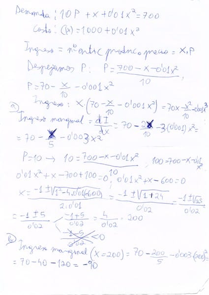Es importante considerar que para encontrar el ingreso marginal con p=10, primero se debe dejar la ecuación de demanda en términos de P, una vez despejado p, sustituir p=10 y despejar x, ese valor de x es el que nos servirá para encontrar el ingreso marginal cuando p=10. Ya que el ingreso marginal nos queda en términos de x y no se puede sustituir p directamente.