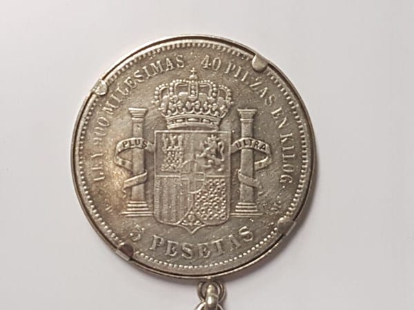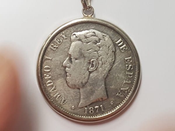 Tengo una moneda de 5 pts de plata de Amadeo I de 1871. Su estado de conservación no es muy bueno. En las estrellas pone en la primera 18 y en la segunda sólo distingo el 3. Está engarzada y me gustaría saber por cuanto la podría vender.