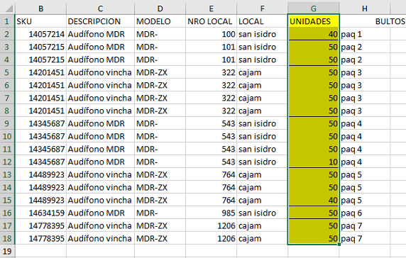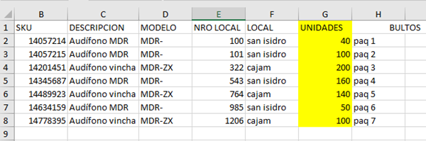 Ejemplo: Si tengo un archivo como en la foto en la columna G hay un SKU por 100 y otro 200.