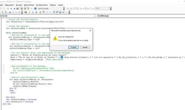 tengo una BD acces con un formulario el cual al presionar X boton envia un mail (modulo de por medio) , mi problema surge que al momento de enviar el mail no puedo lograr que tome datos del formulario , cuando pondo en el .body = "Aviso de Planificación de Viaje Seguro", "En el dia de la fecha el Interno " & Me.cbox_Interno.Column(1) & " con los operarios " & Me.Cbo_Conductor & " y " & Me.Cbo_Acomp & " realizara un " & Me.txtViaje & " aprobado por " & Me.Cbo_Aprueba & " , me dice que la palabra la ME. No es valida ...dejo el codigo a continuacion .-