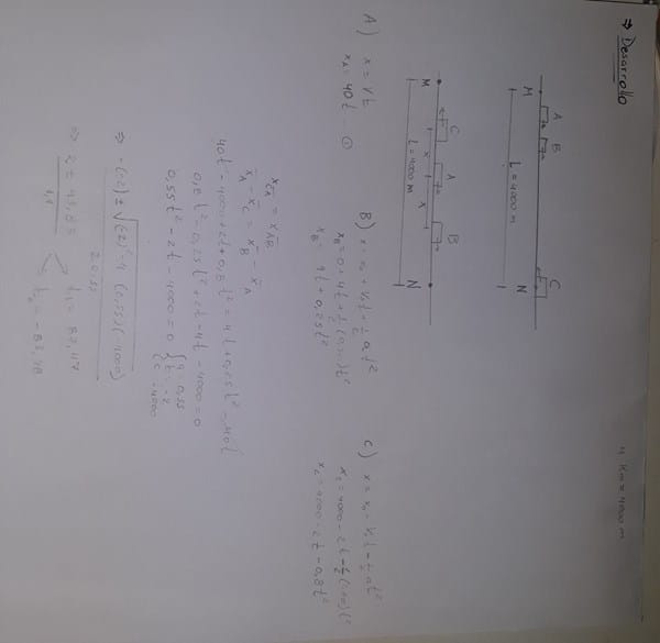 Los puntos M y N se encuentran el uno del otro a una distancia L= 4 km. Por el punto M en dirección al punto N pasaron dos automóviles (A y B) al mismo tiempo. El automóvil A tenía una velocidad de 40 m/s y se movía todo el tiempo con velocidad constante. El automovil B tenía una velocidad de 4 m/s y aceleraba a razón de 0,50 m/s^2. Al mismo tiempo del punto N en dirección al punto M salió otro automóvil con velocidad de 2 m/s y aceleración de 1,60 m/s^2. Determinar en que instante y a que distancia del punto M el automóvil A equidista de los otros dos.