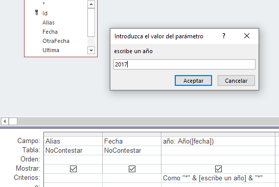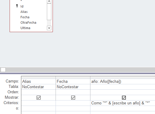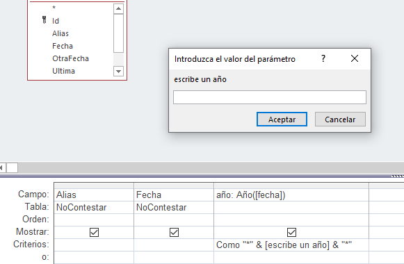 En una consulta quiero establecer un criterio para buscar una fecha por año ([Dime Año]=año(fecha()), pero quiero que, cuando la consulta me pregunte por el campo Año, si se lo dejo en blanco o le pulso asterisco, me salgan todos los registros.