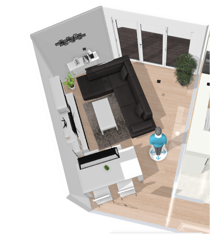 La idea que nos plantean del salón nos deja un poco... Frios, más que nada porque la televisión estaría descuadrada con respecto al sofá y queremos introducir una mesa para comer (si es posible).