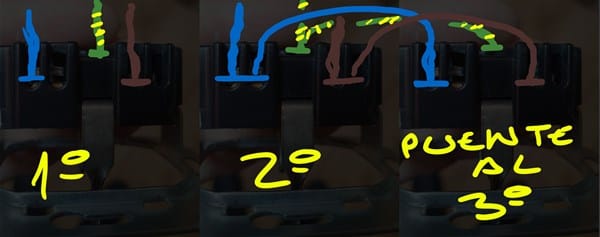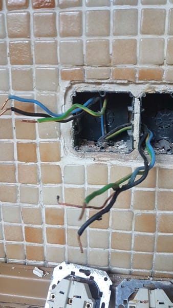 Como se puede ver en las fotos, son 3 enchufes juntos en la cocina y el cajetín de plástico del de la derecha estaba ya quemado. Me di cuenta que el de la izquierda, es el que trae los cables de la pared y esto funciona como se ve en la foto, para el enchufe de la izquierda y el del centro. El de la derecha, que es el que estaba quemado, funcionaba con dos cables que salían desde el enchufe del centro. No habría más problema que volver a poner todo nuevo... Pero ahí es donde está mi duda.