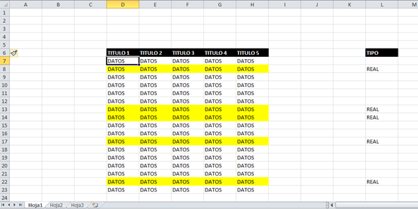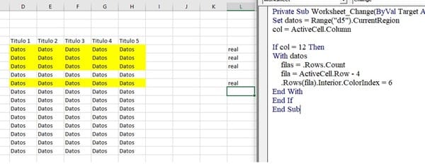 Deseo tener el código de macro en un modulo estándar, que se debe generar cuando escribo la palabra REAL en una celda y esto a su ves se debe pintar celdas de color amarillo en la misma fila, como muestro en la imagen.