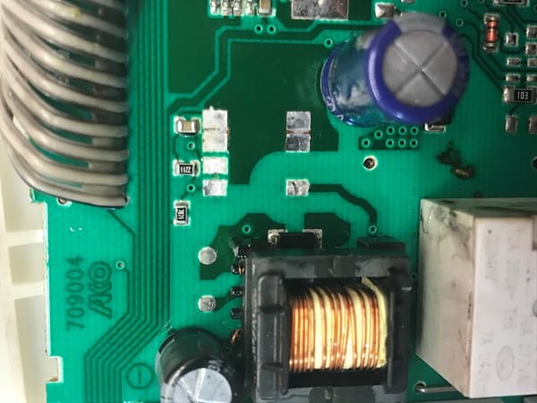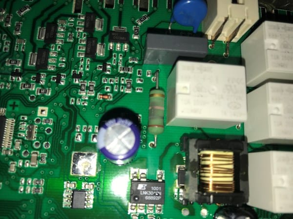 Hola a tod@s. El lavavajillas se me ha quedado sin encender, al desmontarlo todo, he observado que en la placa hay una resistencia quemada. La cuestión es que por el código de colores de la misma, parece que corresponde a una de 180M ohm, cosa que me parece exagerada para esa placa, por lo que os pido consejo sobre cual poner o por si alguien ha reparado o tiene alguna y me puede decir el valor exacto de la resistencia para no dañar más elementos. Es posible que al quemarse haya cambiado de color. He preguntado tiendas de electrónica y me dicen que esas placas suelen montar resistencias de no más de 150 ohm, e incluso he ido al servicio técnico y no saben decirme que valor tiene, que lo mande a fábrica o que cambie la placa entera (120€). A ver si me podéis echar una mano.