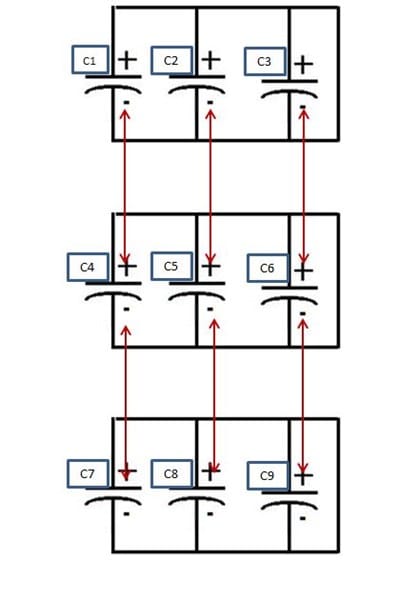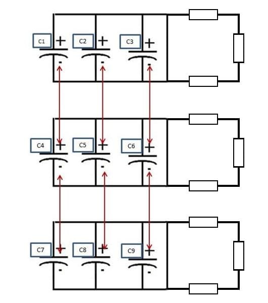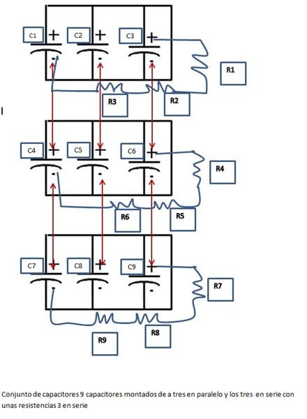 Quiero montar un conjunto de capacitores en paralelo y luego en serie con unas resistencias. Mi pregunta es si el esquema que he hecho está bien. Gracias.