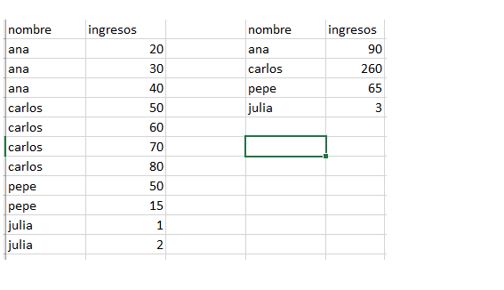 - Suma los valores correspondientes a cada nombre repetido y los coloca en las columnas G