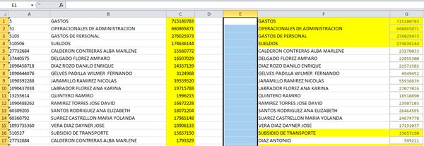 Necesito una macro o formula que copie los datos de la columna A y los pegue en la columna E, haciéndolos coincidir con los datos de la columna F.