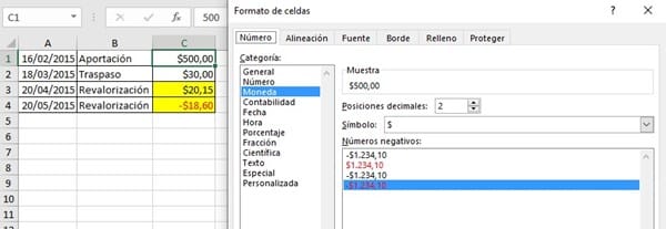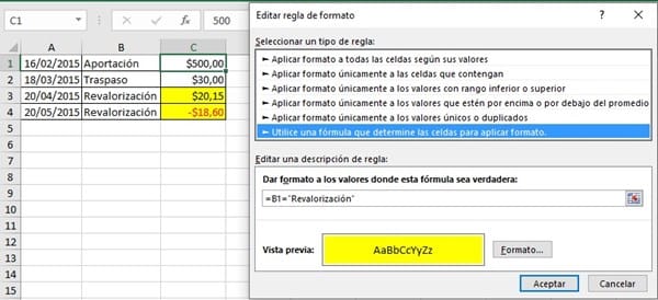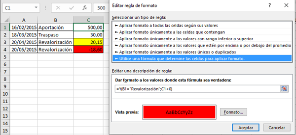 En una hoja de excel datos desde la celda A1 hasta la C3, ¿cómo colorear SOLO las celdas de la columna C cuando coincida que solo en la columna B esté Revalorización y si el valor de la columna C es positivo ponerle un color y si es negativo ponerle otro para diferenciarlo?
