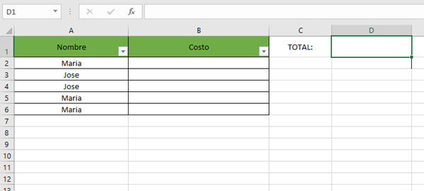 Necesito saber como hacer una suma a una tabla solo cuando aplique un filtro. Se trata de una tabla, en donde registro nombres y datos numéricos. La idea es que cuando seleccione uno de los dos nombres existentes mediante el filtro, me haga la suma en la celda D1, si yo no selecciono un nombre mediante el filtro, la celda deberá de presentar un guión, en caso de que esté tal y como se ve en la primera imagen.