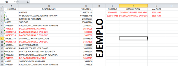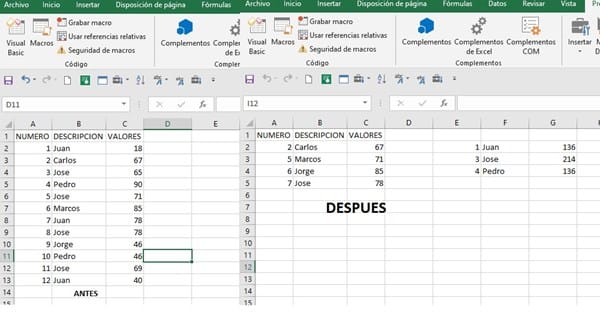 en la imagen. La columna A1 se llama NUMERO, la columna B1 se llama DESCRIPCIÓN y la columna C1 se llama valores. Necesito una macro que elimine los datos repetidos de la columna B1, pero los sume en una sola casilla; a demás que coincida los datos de la columna A1 y B1 en las celdas E1 y F1 respectivamente.