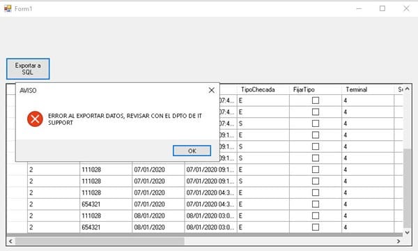 MsgBox("ERROR AL EXPORTAR DATOS, REVISAR CON EL DPTO DE IT SUPPORT", vbCritical, "AVISO")