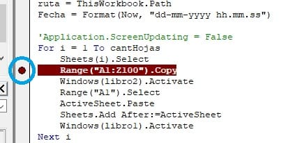 Private Sub CommandButton1_Click() Dim Fecha As String On Error Resume Next Range("A1:Z100").Select Selection.Copy Workbooks.Add ActiveSheet.Range("A1").PasteSpecial Paste:=xlPasteAll Fecha = Now Fecha = Replace(Fecha, "/", "-") Fecha = Replace(Fecha, ":", ".") Application.DisplayAlerts = False ActiveWorkbook.SaveAs Filename:="(aqui va la ruta)" & Fecha & " .xlsx" ActiveWorkbook.Close Application.DisplayAlerts = True contador = Sheets.Count For i = 1 To contador Sheets(i).Activate With ActiveSheet If .ProtectContents = True Then On Error Resume Next .UsedRange = "" On Error GoTo 0 End If End With Next i End Sub