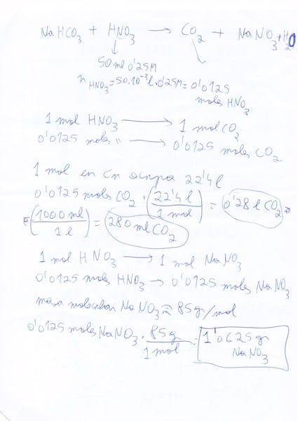 ¿Qué volumen de dióxido de carbono, en c.n., pueden generarse? ¿Qué masa de nitrato de sodio se formará?