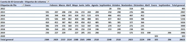 Hola, tengo esta tabla dinámica pero me repite algunos meses, por ejemplo de 2019 no pone el total de abril ni septiembre donde corresponde, sino en una columna después de Diciembre, lo mismo enero de 2020