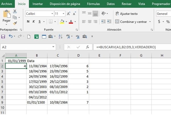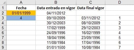Osea, si yo doy una fecha, en la celda A2, en la fecha A3 me de el valor que asocio entre un intervalo de tiempo definido entre las columnas "B" i "C". En mi caso doy como fecha 01/01/1999 y me busca el valor de la derecha del intervalo en cuestión.