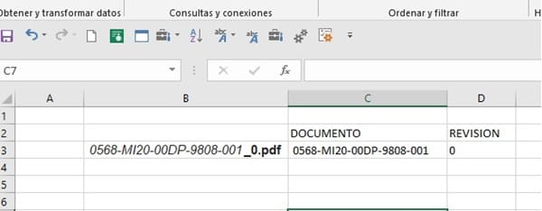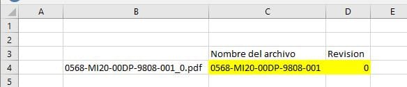 Tengo un libro de excel con una listado en la columna B, comienza desde la fila 4 hasta "n". El texto de cada celda tiene siempre la misma estructura, se separa por guiones medios y al final siempre queda un guion bajo, un numero y la extensión del documento. Ejemp: " 0568-MI20-00DP-9808-001_0.pdf ".
