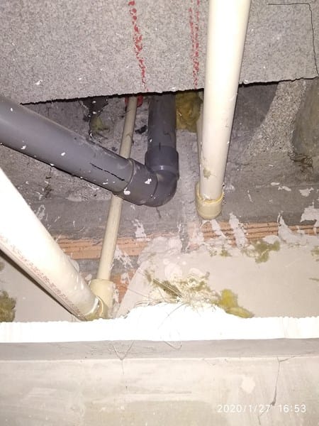 Estamos teniendo problemas con el desagüe del fregadero de la cocina que traga muy poco y se atasca. El tubo tiene poca pendiente, va por debajo del forjado, está hecho en tubo de 40. Según se ve en la foto, la salida está hacia la izquierda y me gustaría pasarla hacia la derecha. A partir del codo de 90º, e