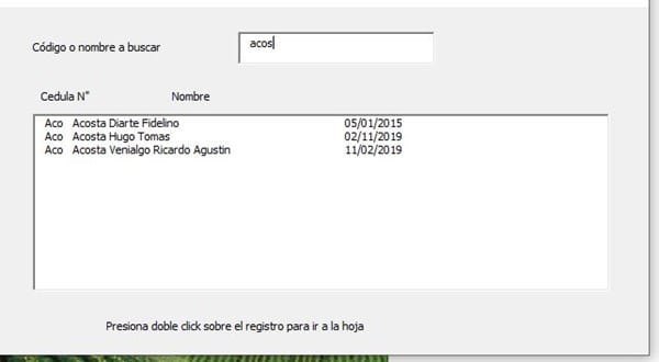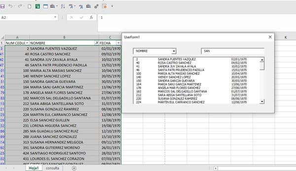 Favor si me podrian ayudar a armar una busqueda dinamica de mi lista de funcionarios, tengo una hoja donde le llame "catastro" y esta consta de 5 columnas, y tengo otra hoja que se llama "consulta", en la hoja consulta quisiera hacer clic en un boton de comando y que me aparezca un formulario de busqueda dinamica tal cual lo mostrare en una imagen de modelo, lo que quiero es que pueda buscar por cualquier criterio o sea ingresando el apellido o el nombre o su numero de DNI y que me muestre las coincidencias en la pantalla previamente antes de elegir y cuando ubique el nombre, le quiero dar doble click o sino capturarlo con un boton y que me lleve la seleccion en la celda C4 de la hoja consulta, como veran puse el apellido "Acosta" y automaticamente me va trayendo las coincidencias, lo que no logre mostrar son las demas columnas de la hoja de catastro solo logre mostrar en pantalla 3 columnas, si me pueden ayudar desde ya les agradezco