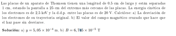 He calculado la velocidad que lleva el electrón, la cual me sale 2,96 x10^7 m/s, el valor del campo eléctrico me sale 2000 N/C.