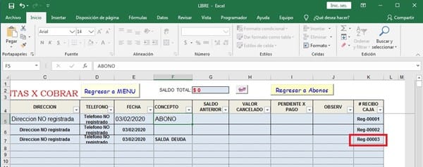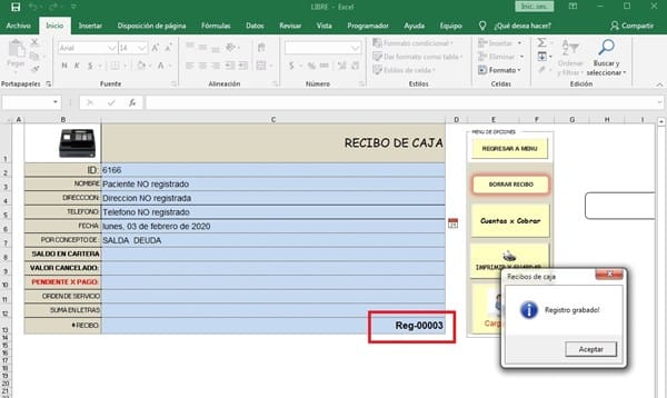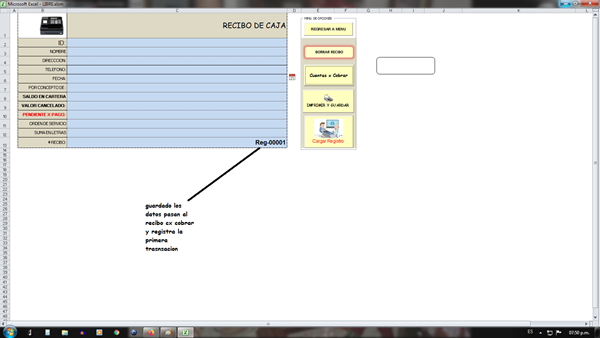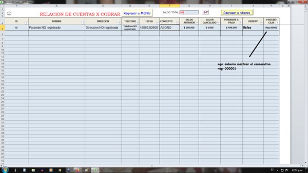 Pero al guardar estos datos en otra hoja "recibos (cuentas por cobrar) donde debe ir el consecutivo es no lo aumenta sino q permanece en "REG-00000". Pero si hago otra impresión lo reistra en la segunda fila