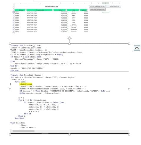 La hoja2 se llama "Registros", aquí yo voy a registrar todos sus pagos mensuales, que pasa en la columna b5 de la hoja2, para evitar equivocarme con los datos de mis funcionarios, ya que realizo tablas dinámicas para ver sus sueldos, tengo 1200 funcionarios, y con validación de datos lista, resulta muy tedioso buscarlo usando la barra de desplazamiento del mouse, como en la columna B5, b6, b7, b8, b1000 ingresare diariamente mis movimientos por funcionario, quisiera saber la forma de que al tipear por ejemplo "acosta", me traiga todos con apellido "Acosta" o simplemente su nombre "Juan", y yo al darle doble click me lleve a la celda b5, luego ingreso otro y me lleve a la celda b6, luego b7 y así sucesivamente, hay alguna forma de hacerlo, y si me equivoco que me salga un mensaje de que el funcionario no esta catastrado y no me permita continuar, desde ya les agradezco, adjunto una imagen