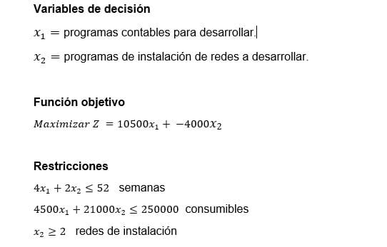 Puede elegir entre desarrollar programas contables o instalación de redes. Cada programa contable requiere 4 semanas de desarrollo y $1500 de consumibles. Un programa cuesta $3000 y puede venderse en $15000. Para la instalación de redes esos valores son 2 semanas de instalación, $9000 de consumibles, una instalación de redes cuesta $12000 y puede venderse en $17000. La empresa tiene 52 semanas disponibles de trabajo, el programador dispone de $250000 para invertirlos en la compra y mantenimiento. Por último, se desea tener más de dos instalaciones de redes. Plantee este problema en forma de PL para maximizar las utilidades al final del periodo.