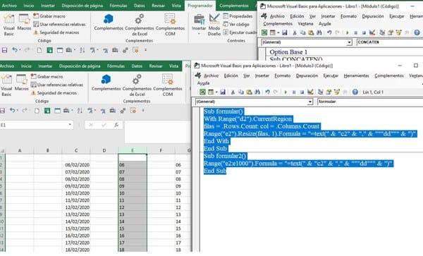 Tengo la siguiente fórmula =TEXTO(D2;"dd"), que realizo la fórmula en la columna DE la cual arrastro dependiendo de la cantidad de datos hacia abajo por ejemplo hasta 1000. ¿Cómo podría convertir esto en un código de macro?