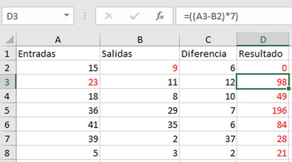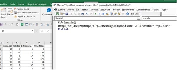Quisiera poder pasar la fórmula de la imagen a una macro, lo que hace la fórmula es que las entradas en la columna A se restan con las salidas de la fila anterior de la columna B y